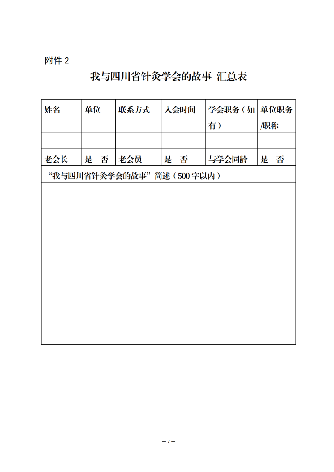 2.老会长、老会员及与学会同年龄会员需填写《我与四川省针灸学会的故事汇总表》(附件 2)。