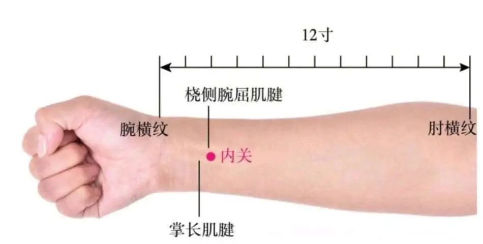 定位:腕掌侧远端横纹上2寸,掌长肌腱与桡侧腕屈肌腱之间。